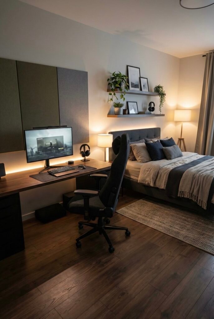 Ditch the metal bed frame. A tufted grey upholstered headboard adds softness to the room and absorbs sound. It’s the anchor of the “sleeping zone” and contrasts perfectly with the hard technology on the desk.